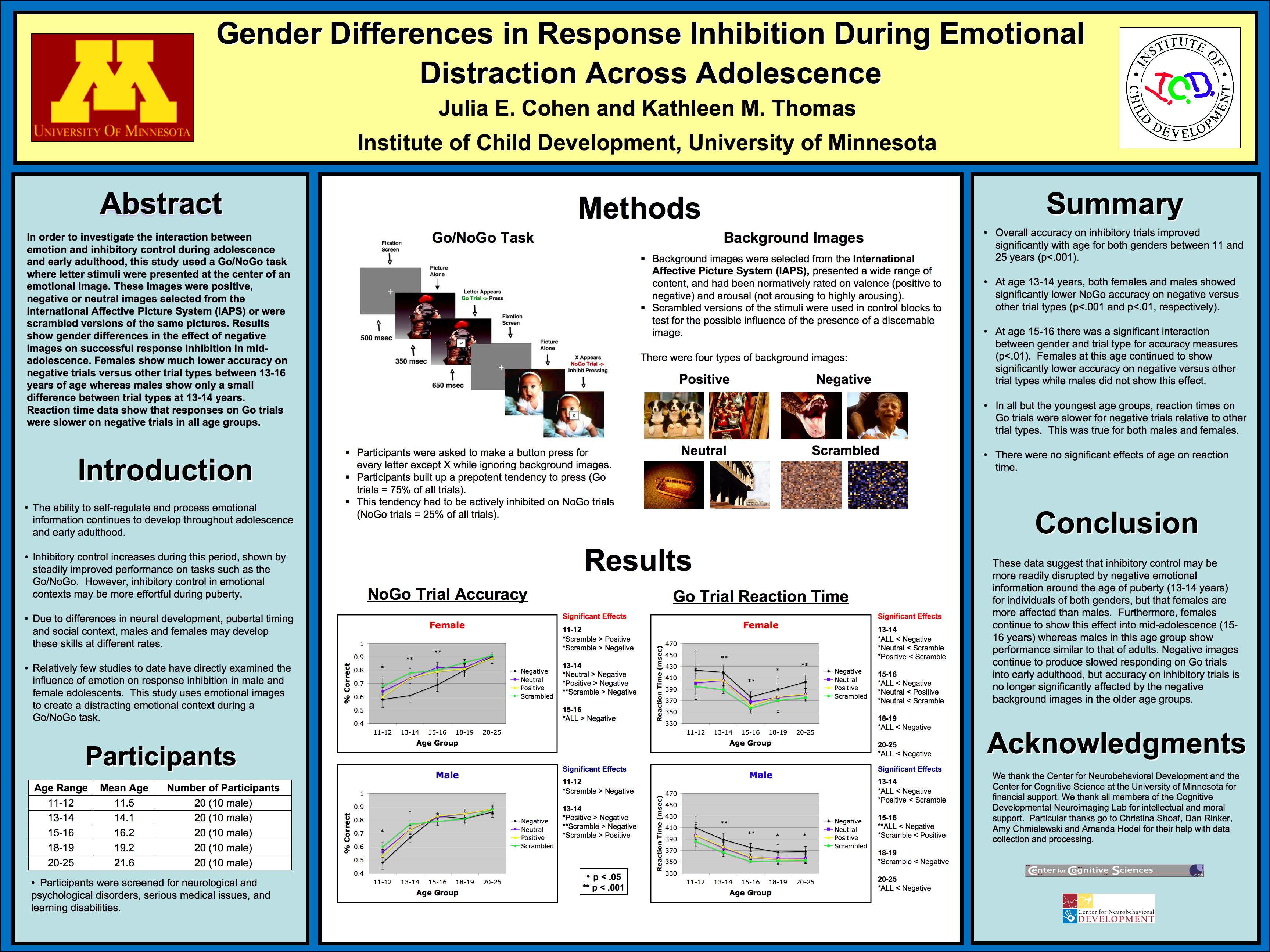 - Cohen, J. E., & Thomas, K. M. (2009, April). Gender difference in response inhibition during emotional distraction across adolescence. Proceedings of the Society for Research in Child Development. View jpg file.